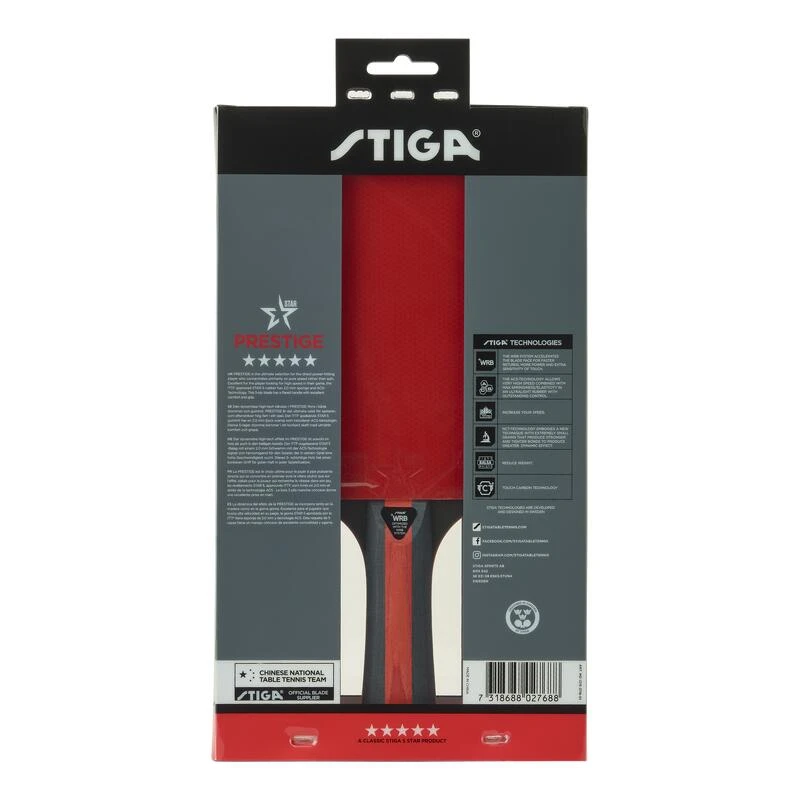 Prestige, pour les joueurs en quête de vitesse. Lame à 5 plis, caoutchouc 5 étoiles approuvé par l’ITTF, mousse de 2,0 mm avec technologie ACS pour la vitesse, la puissance et la sensation